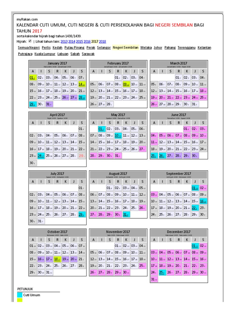 Kalendar Cuti Umum Cuti Negeri Cuti Persekolahan Bagi Negeri Sembilan Tahun 2017 Pdf